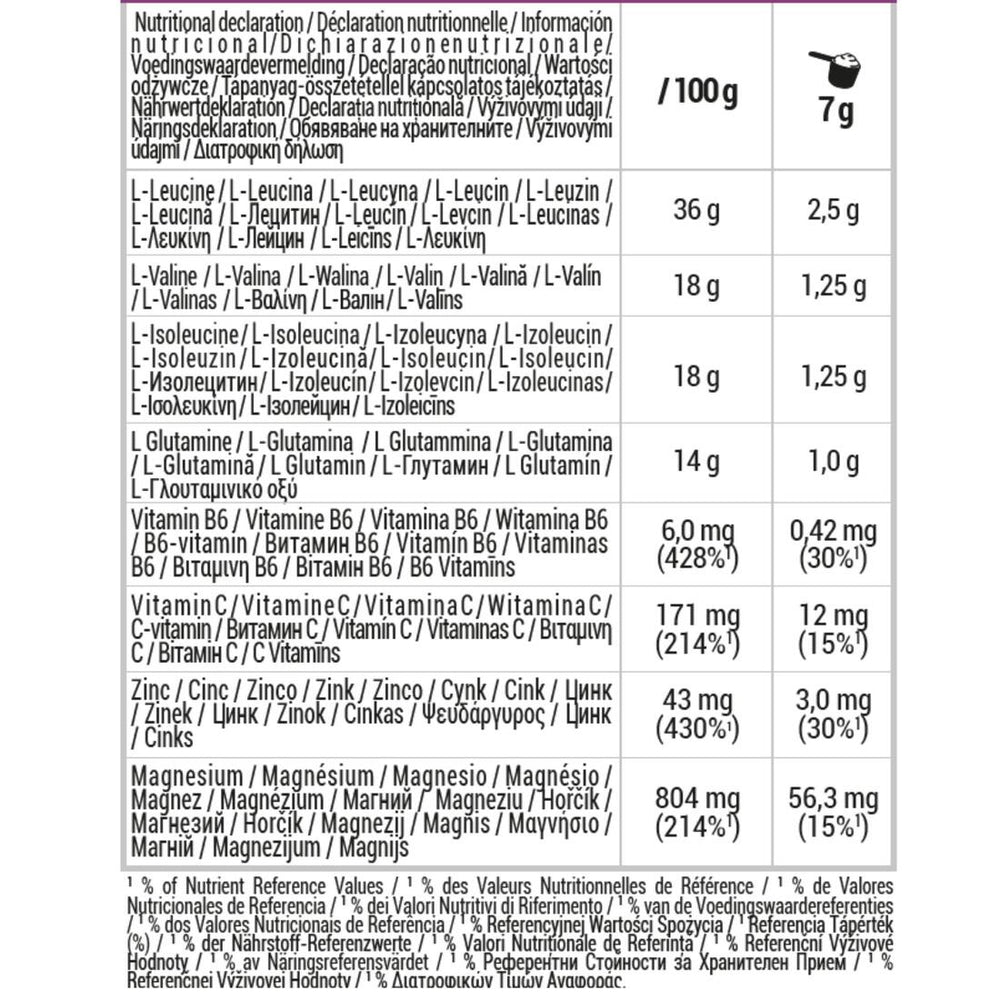 5 g de BCAA + 1 g de glutamina/batido para conseguir tus objetivos Suplemento rico en magnesio y vitamina B6 para la reducción de la fatiga. Fuente de magnesio y vitamina C para contribuir al funcionamiento del sistema inmunológico Uso de sabores naturales y moléculas edulcorantes de la estevia
