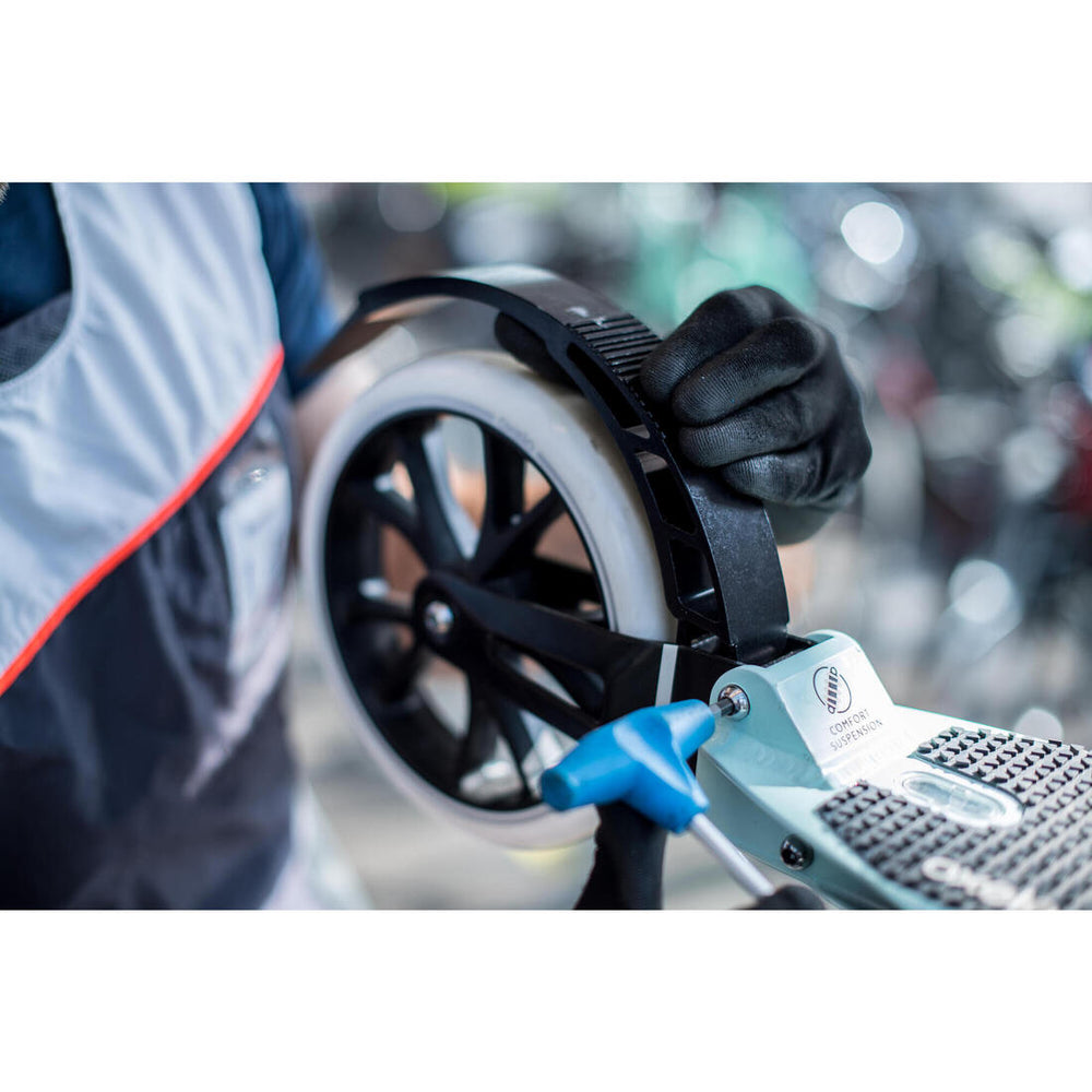 La pérdida de eficacia del freno del scooter puede deberse a varias causas (desgaste de la rueda, mango de freno estropeada, lubricación insuficiente del cable y la funda); en caso de duda, recomendamos que encargues a un técnico de nuestros talleres Decathlon que compruebe el origen del problema.