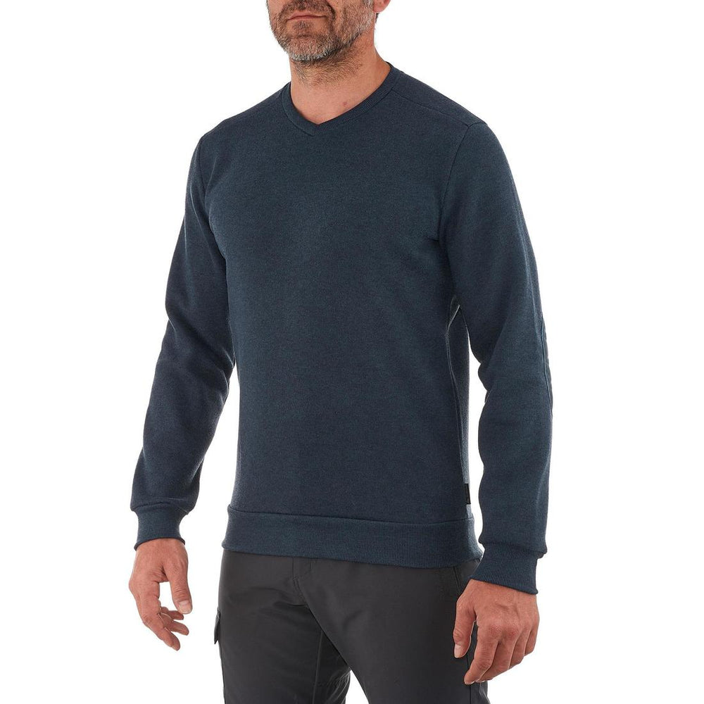 Suéter de senderismo NH150 con cuello en V, cálido y transpirable, diseñado para aportar calor y confort durante paseos por la naturaleza con clima fresco.